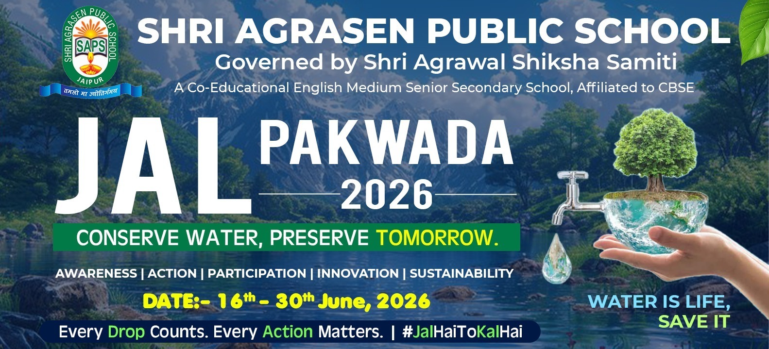 Shri Agrasen Public School, governed by Shri Agrawal Shiksha Samiti, initiated in July 1980, marks its importance in the history of saps, as on this day, a new sapling was sown at Jaipur, which now stands as a strong, protective harbour, giving gratification of education and moral values to its students.